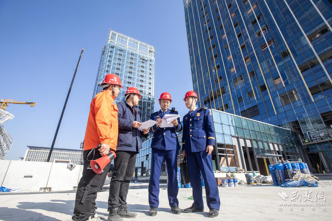 图为黄石消防救援支队走进国乒训练基地施工现场开展高层建筑消防安全专项检查