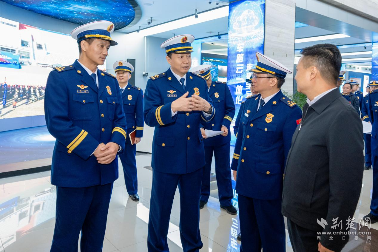 图为湖北省消防救援总队总队长董新明在武汉越秀财富中心检查高层建筑消防安全