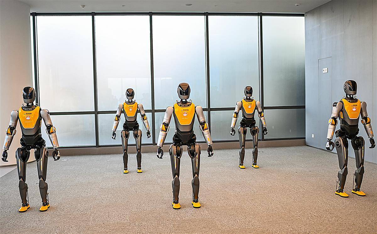 12月12日,伴随古琴韵律,湖北人形机器人创新中心的5台迎宾人形机器人,舒展双臂,流畅演绎一套太极拳。