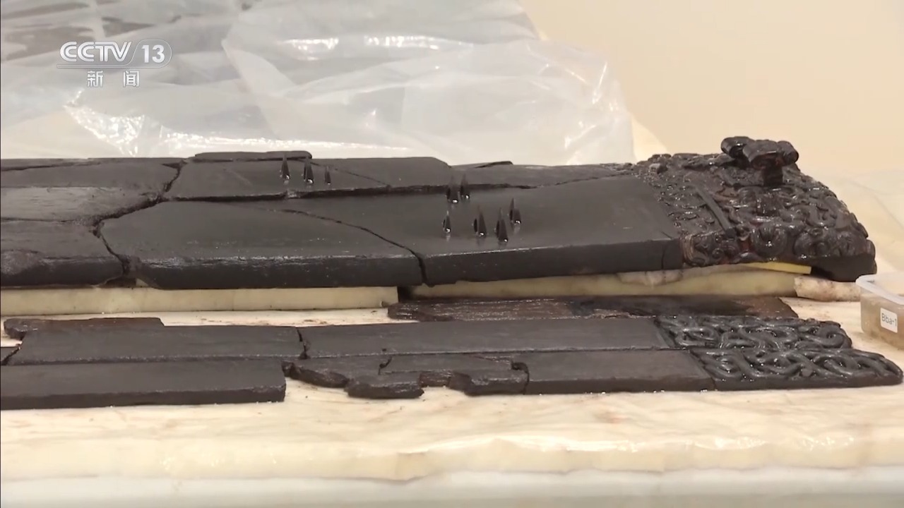 这张25弦漆木瑟几近完整,尾端浮雕龙纹,岳山、瑟枘、瑟柱等构件保存完好,为后续复原提供可能。这批漆木瑟中,最长的约2.1米,为迄今出土的最大瑟。