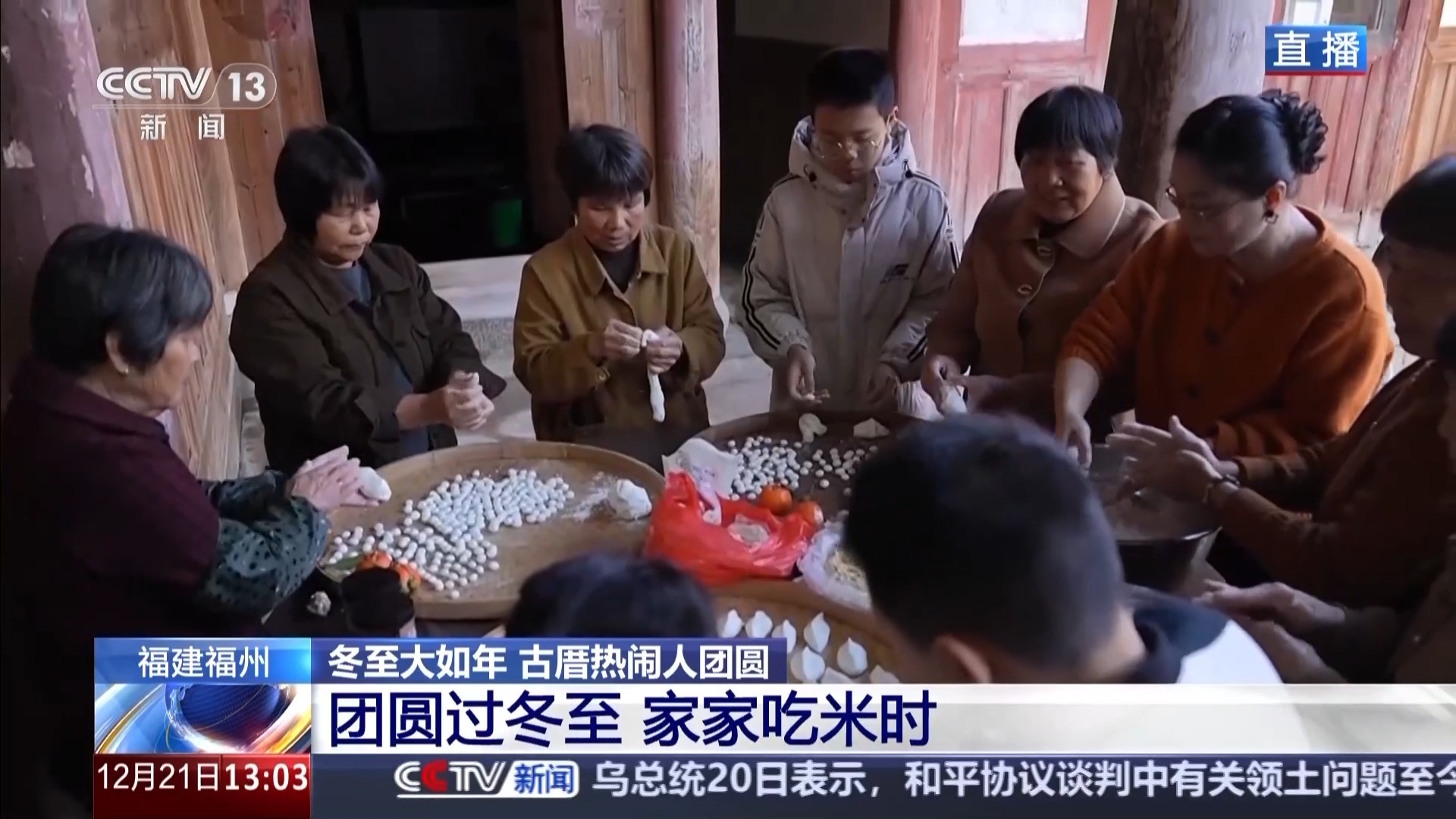 总台记者 赵晟萱:我所在的位置是福州市罗源县的潮格村,今天是冬至节气,在当地一直有着“冬至大如年”的说法,今天跟春节一样都是格外重要的团圆时刻。在我身后的古厝小院里,灯笼高挂,男女老少聚在一起,听戏品美食,一起过冬至。