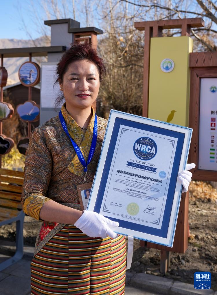 12月20日,拉鲁湿地国家级自然保护区工作人员展示拉鲁湿地获得的“世界海拔最高的城市天然湿地”证书。