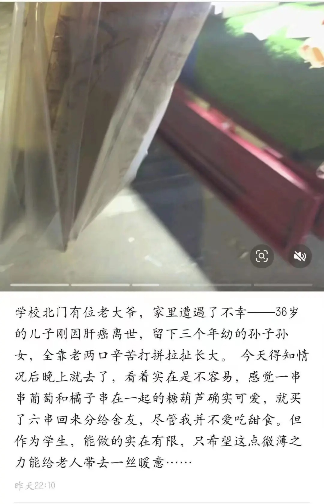 接受中国之声记者采访时,田大爷说:“给儿子办完丧事回来后,学校北门卖水果的摊主,在一个学生群里发了我的情况,之后学生又转发。我儿子有三个小孩,大的才七岁,最小的不到四岁。家里还有两个老人,父亲九十岁,母亲小脑萎缩。我身子也不行,腰疼好几年了。”