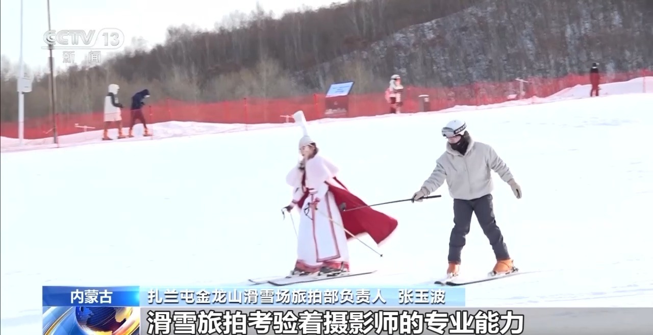在内蒙古呼伦贝尔市的扎兰屯金龙山滑雪场里,游客们身着民族服饰、脚踩滑雪板,在雪道上尽情驰骋。专业摄影师手持相机穿梭其间,用镜头定格下游客们的飒爽风姿。
