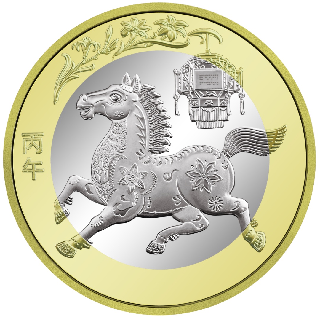 背面图案为中国传统剪纸艺术与装饰年画元素相结合的马形象,衬以花灯和萱草图案,币面左侧刊“丙午”字样。