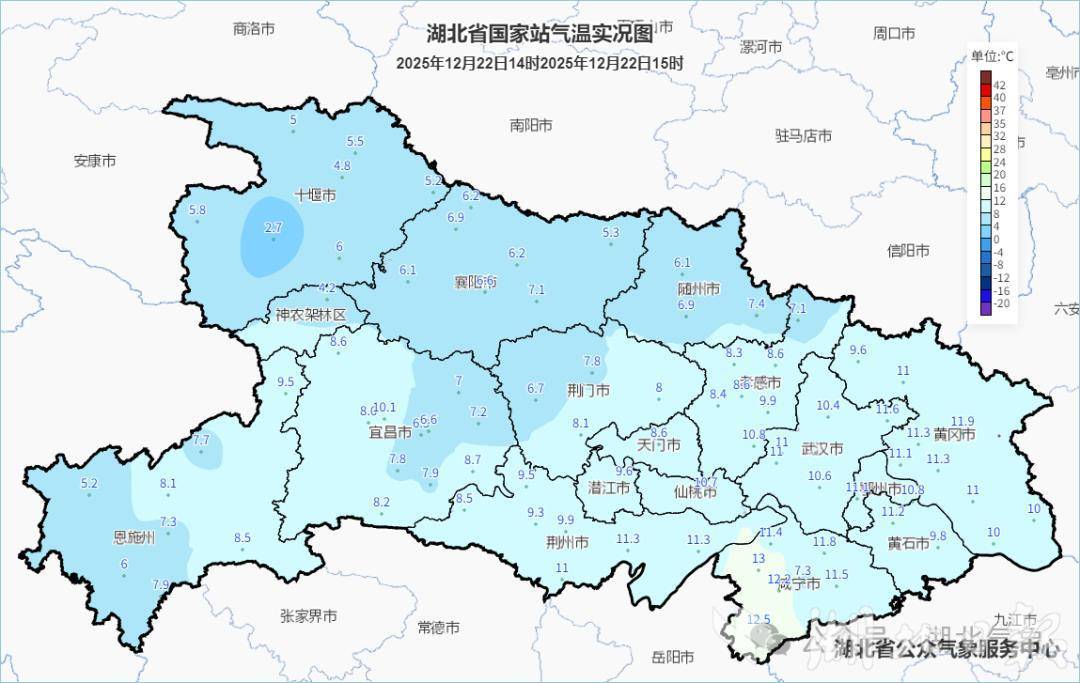 气象部门预计,22日晚到24日,湖北阴雨天气依旧“霸屏”,鄂西半高山以上地区还会出现雨夹雪或小到中雪,气温整体略有起伏。23日和24日冷空气又来凑热闹,省内将刮起4到6级偏北阵风,风寒效应叠加阴雨,体感会更冷。转机将在25日到来!届时全省转为晴到多云天气,最高气温逐步回升,天气终于要放晴。不过升温的同时,最低气温会明显下降,北部地区最低气温将跌至冰点附近,早晚出门可得裹严实。