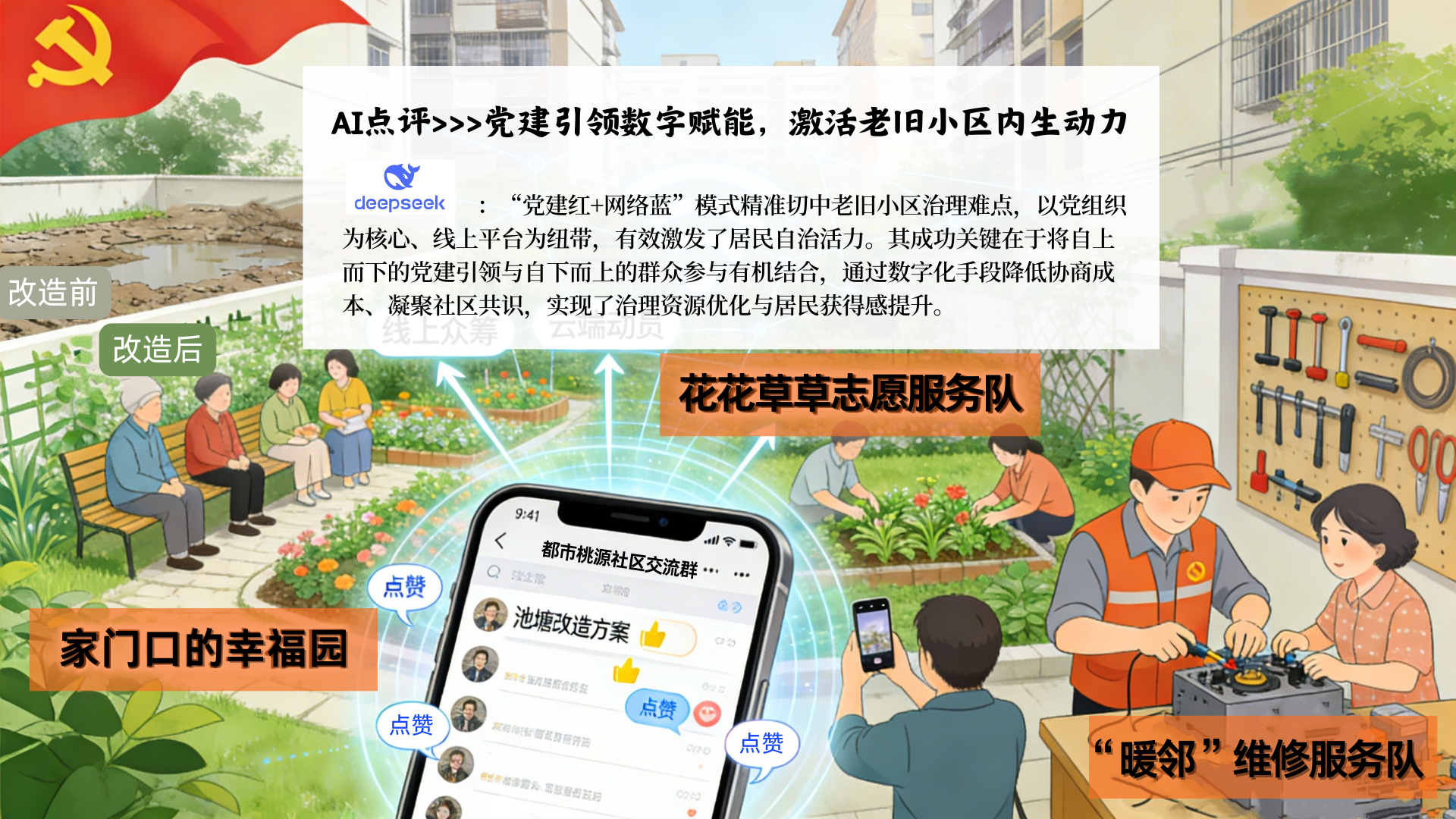 该小区将“分散力量”整合为“线上联动、线下落实”的协同合力,总结“三三一”邻里党建工作法——以党组织体系为核心、以自治组织为关键、以管理服务为支撑,构建街道—社区—小区“三级联动”机制,把党支部打造成联系群众的“前沿哨所”。创新“线上筹点子、云端筹改造金、邻里共管”三步工作法,通过线上平台发布改造方案、公开资金使用明细,开通微信支付众筹通道,短短15天筹集居民资金2万余元;结合“455亮星行动”红榜公示、居民满意度评价等机制激发参与热情。在2000平方米小区改造中,通过线上群发布投工投劳招募信息,组建50余人的“花花草草志愿服务队”,实时调度劳务分工;邀请居民通过短视频平台记录改造过程,累计发布改造动态32条,获邻里点赞转发千余次。最终将20万元预算工程建成“家门口的幸福园”,既盘活“居民智慧+单位资源+能人力量”,又实现政府资金投入与治理效能“双提升”。