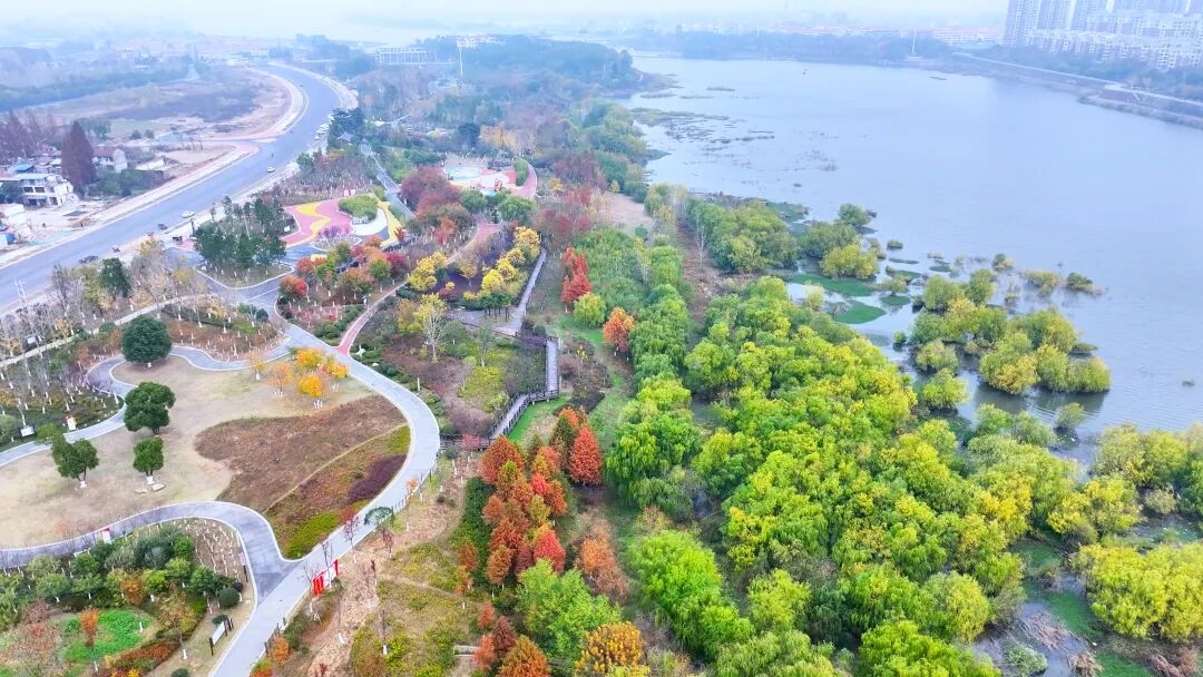 远处的人工湿地则种植了大片的菖蒲、鸢尾、美人蕉等水生植物,既能有效净化水质、涵养水源,又能为小型鸟类和昆虫提供栖息空间。