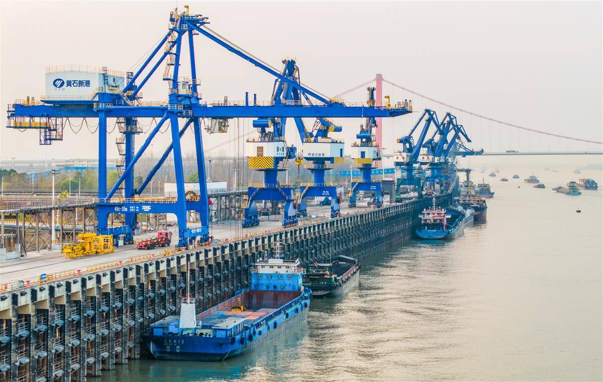 黄石新港港口各作业码头,运输车辆穿梭如织,货物进出繁忙。(湖北日报全媒记者 薛婷摄)