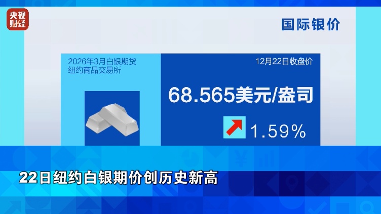 与此同时,受美联储降息、供应紧缺、投资需求和工业需求显著增加等因素综合影响,白银期价也延续强劲涨势。截至22日收盘,纽约商品交易所明年3月交割的白银期价收于每盎司68.565美元,涨幅为1.59%。