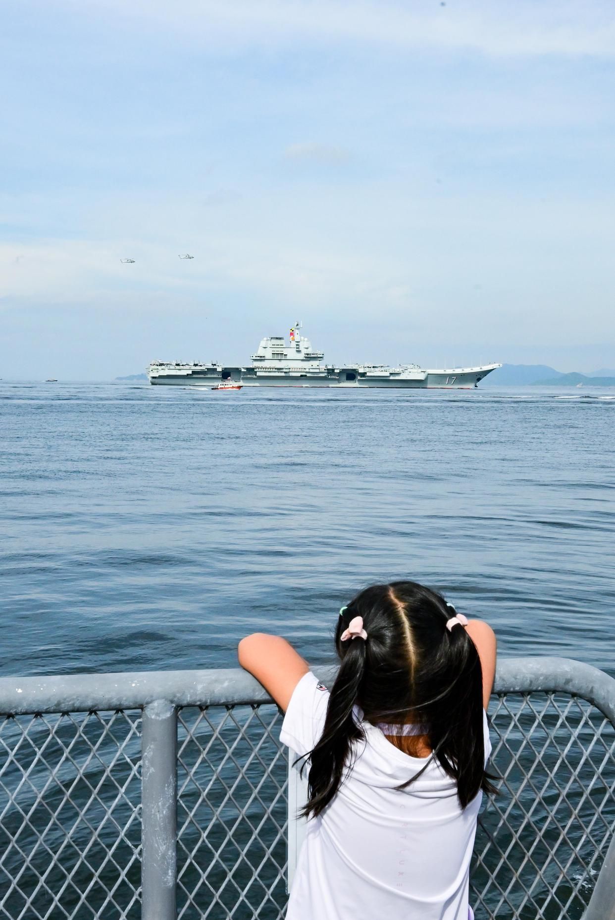 7月3日,中国海军山东舰航母编队抵达香港,一名儿童在岸上观看海军山东舰。