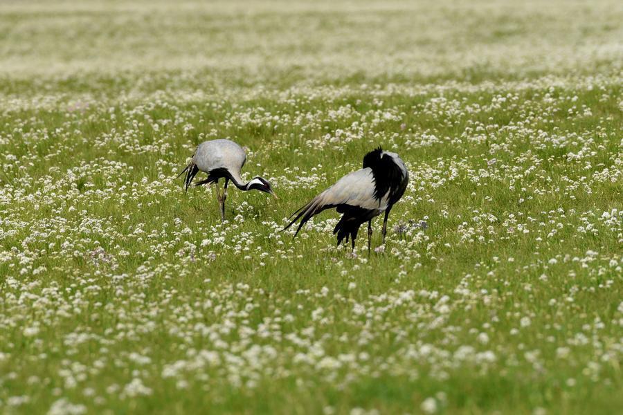一对蓑羽鹤在内蒙古乌拉特中旗草原上觅食。新华社发(支茂盛摄)