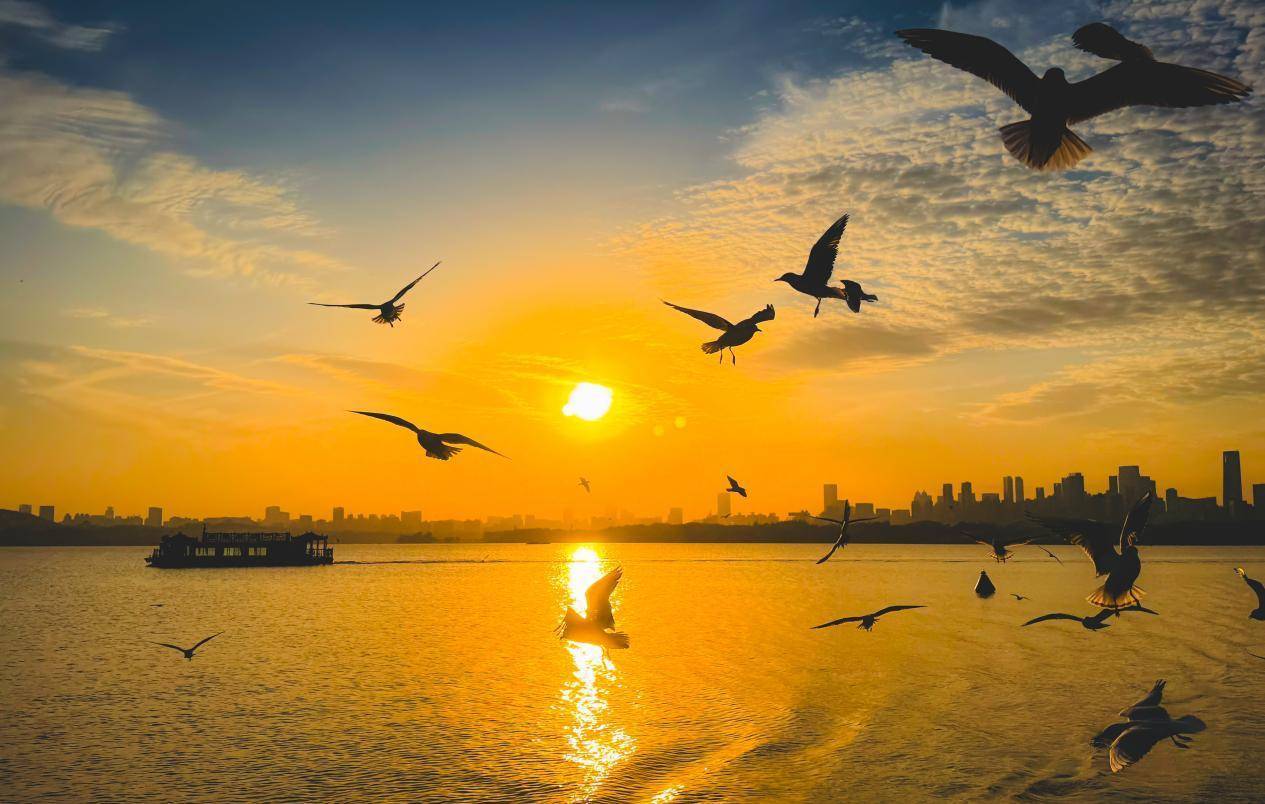 当东方天际晕染开橘粉色霞光,朝阳缓缓升起,成群红嘴鸥追着船舷盘旋飞舞,红喙白羽与橘色天光相映成趣。它们时而掠水激起层层涟漪,时而振翅冲向天际,与游客共赴这场破晓之约。