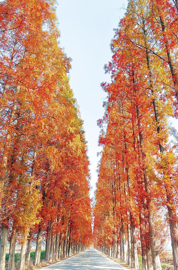 在付家垸村与大湾村交界处,一条笔直的水杉路在冬日暖阳下静躺。两排高耸的水杉尽染金红,宛如一道流光溢彩的隧道。每到周末,这里便热闹起来——前来打卡的游客络绎不绝,甚至有不少新人专程来此拍摄婚纱照。