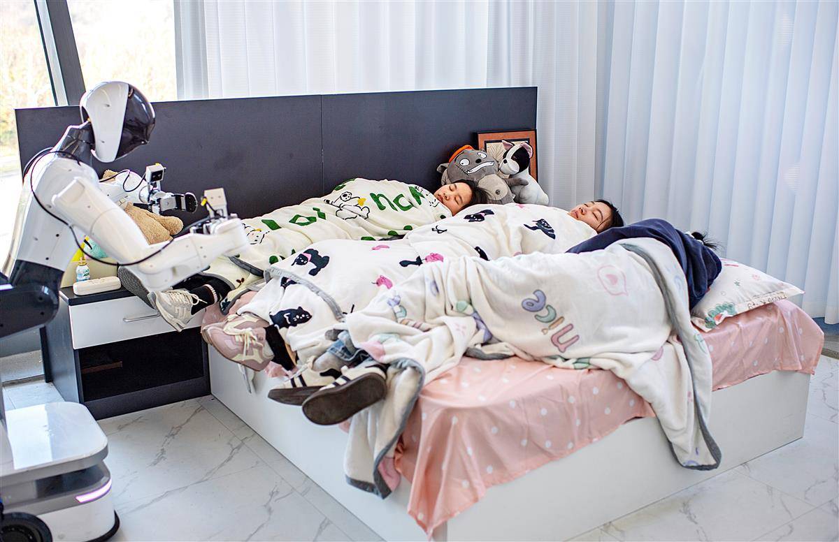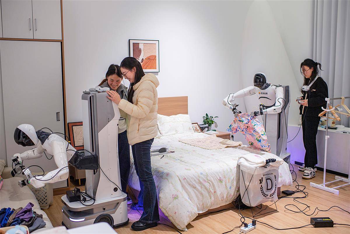 走入训练场,仿佛进入了“科幻片场”:有人戴着VR眼镜,在虚拟场景中一遍遍模拟“叠被子”“放冰箱”;有人站在真实机器人旁,引导它完成“倒水”“出餐”等动作。他们的任务,就是用真机一遍遍重复人类日常动作,采集数据,“喂”给AI大模型,让它学会“自己动”。