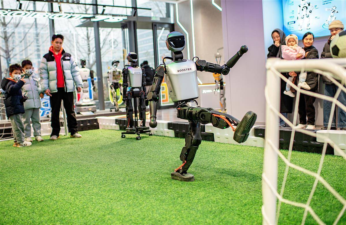 2月20日,在光谷人形机器人7S店(全国首家)内,一名小男孩在训练师的指导下,操控人形机器人踢足球。该店以销售、展示、培训等七大功能,搭建起连接研发、生产与用户的全链条服务。