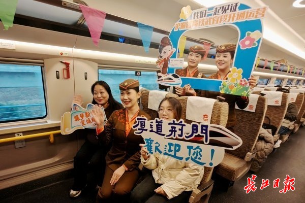 汉口站内,“龙韵骧梦”首发乘务组已经就位,她们身着咖色为主调、点缀橙色梅花刺绣的制服,寓意着“橙”心“橙”意的服务理念。