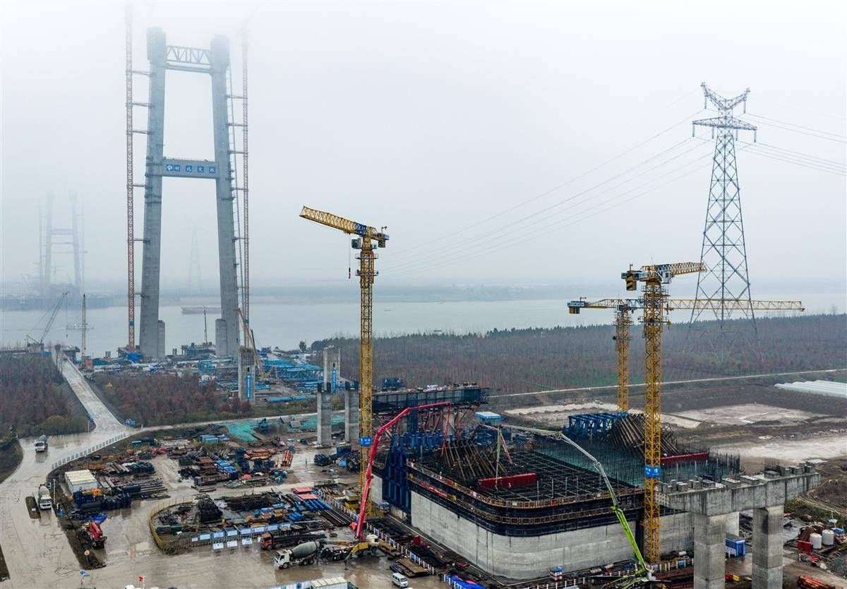 12月23日,中建三局荆州李埠长江公铁大桥项目施工现场一片繁忙,建设者们正全力冲刺2026年春节前主塔封顶的关键节点,各类施工工序有序推进。据了解,目前北岸主塔上/下游第35节塔柱施工完成,上横梁支架已经安装到位,正在抢抓上横梁施工,辅助墩、支墩施工完成,边墩已经完成60%,锚体正在进行第六层钢筋绑扎,散索鞍支墩第四节准备浇筑混凝土。作为世界最大跨度的双层斜拉悬索协作体系公铁两用大桥,该项目建成后将完善长江经济带骨干路网结构,助推荆州跨江融合发展。