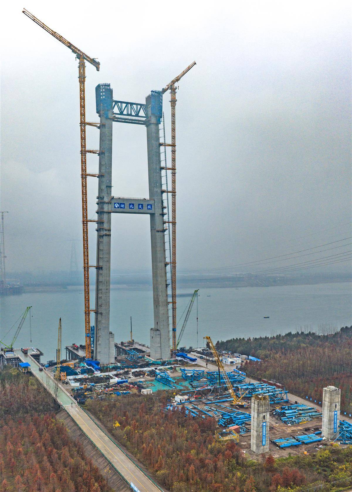 荆州李埠长江公铁大桥项目施工现场一片繁忙,他们正朝着2026年春节前主塔封顶冲刺。