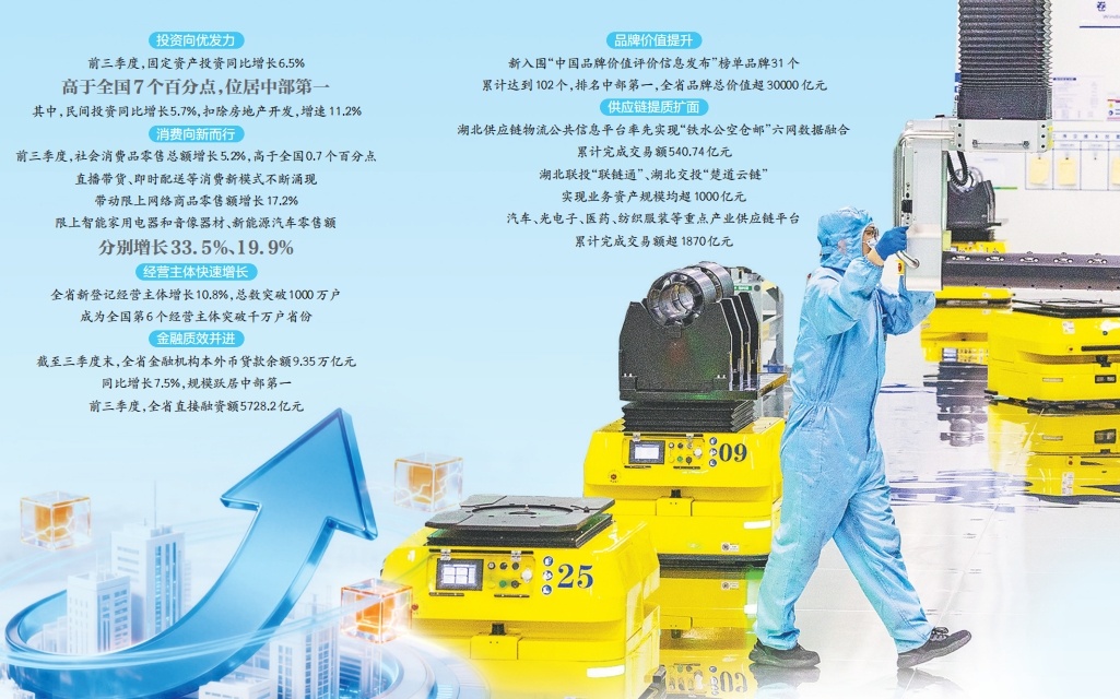 今年以来,湖北锚定“加快建成中部地区崛起的重要战略支点”使命任务,将“能级跨越”置于“七大战略”首位,以只争朝夕的干劲推动发展质效双升。前三季度,全省GDP同比增长6%,增速位居经济大省第一位;经济总量占中部地区比重达20.7%,同比提升0.3个百分点。