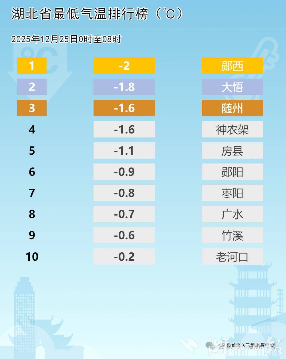 湖北日报讯(记者曾莉)本周以来,湖北持续阴雨天气,湿冷感满满。25日早晨,最低气温进一步下探,随州、十堰等地跌破冰点。不过,未来三天以晴到多云为主,双休日最高气温将升至14至19℃。
