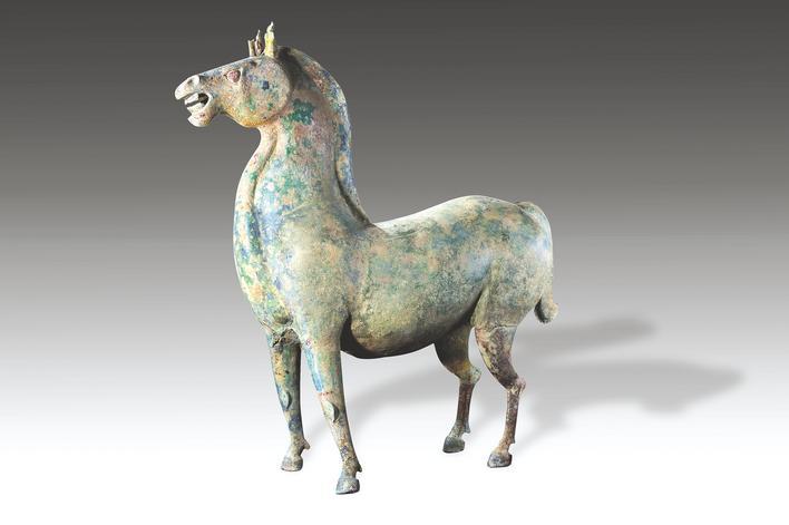 要说湖北各地收藏的骏马天团,领衔的非襄阳市博物馆藏“中华第一青铜马”莫属!这匹从三国穿越而来的青铜马,出土于樊城菜越三国1号墓,以真实马匹的形体比例浇铸而成。身高、体长均163厘米,重达720斤,体量堪称迄今出土青铜马之最。其形体精干、肌肉结实,头微昂作嘶鸣状,前额铸当卢花纹,双耳间的额头上插璎珞的纛,尽显雄浑气势。专家称,墓主人身份相当于二千石以上大将军、州刺史级别的官吏,墓中多件器物的风格及铭文内容揭示其可能是来自西北的将军。这匹马也成为三国时期马种与丧葬文化的重要见证。