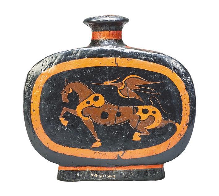出土于云梦睡虎地44号墓的秦代彩绘牛马鸟纹漆扁壶,是仿铜漆器的代表作。通体髹黑漆,以红、褐漆彩绘,一面绘立牛,一面绘奔马与飞鸟,借鸟翔烘托马驰之态。有专家推测,此壶为酒器,是墓主人远行时随身携带的珍爱之物。