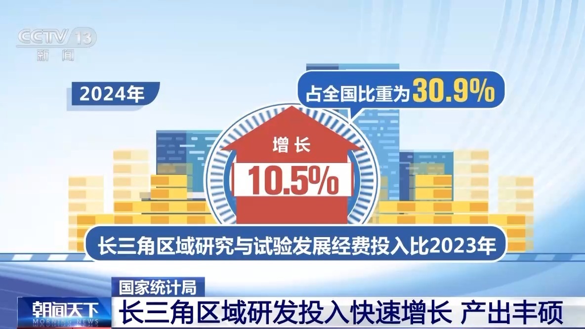 科技创新投入不断加力。2024年长三角区域研究与试验发展经费投入比2023年增长10.5%,占全国比重为30.9%。