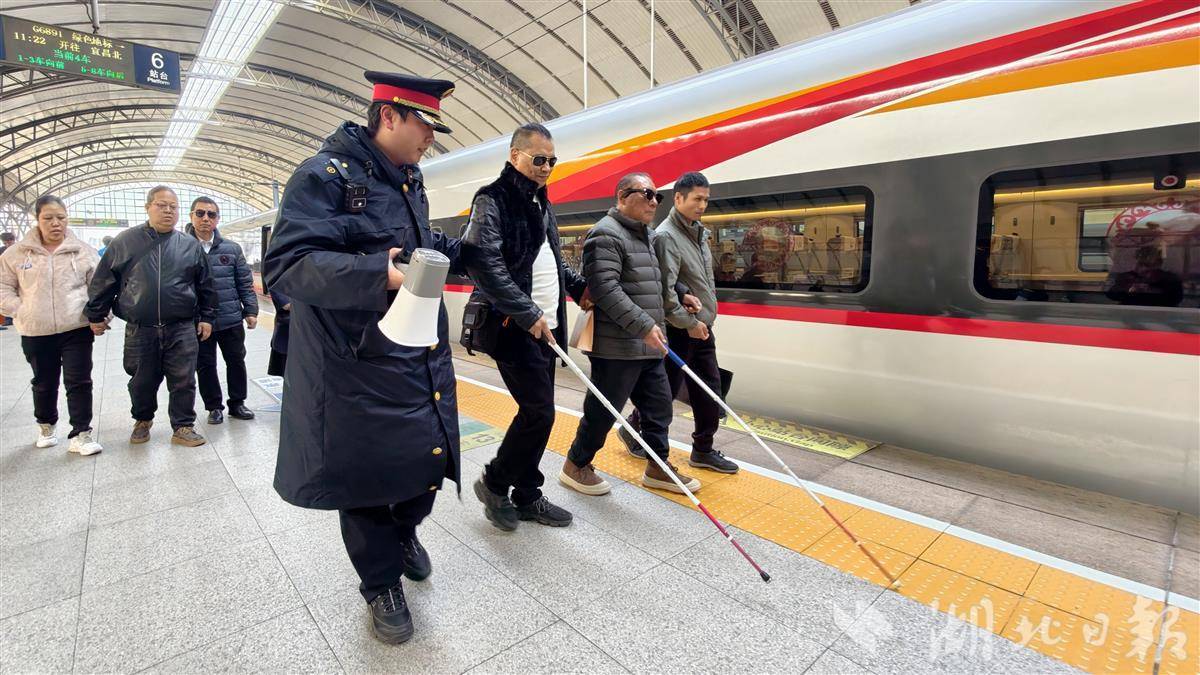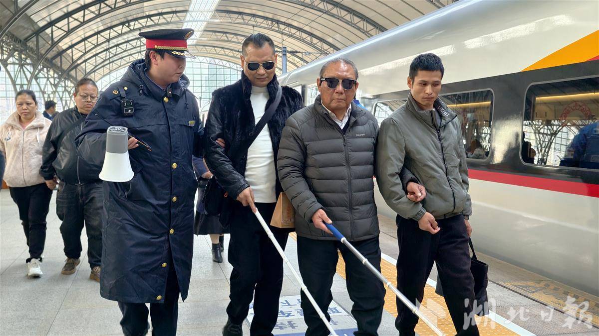 首趟宜昌北抵汉列车抵达汉口站,两名盲人乘客在站务员全程护送下畅行出站。