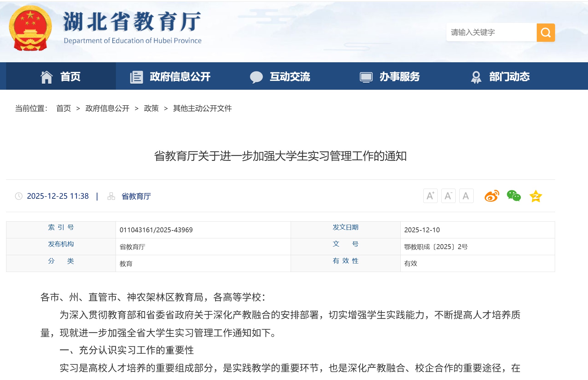湖北日报讯(记者陈熹、通讯员梁炜)12月26日,从省教育厅获悉,于近日发布的《关于进一步加强大学生实习管理工作的通知》,要求各地各校持续加强实习工作组织,严格规范实习过程管理,切实强化实习综合保障。
