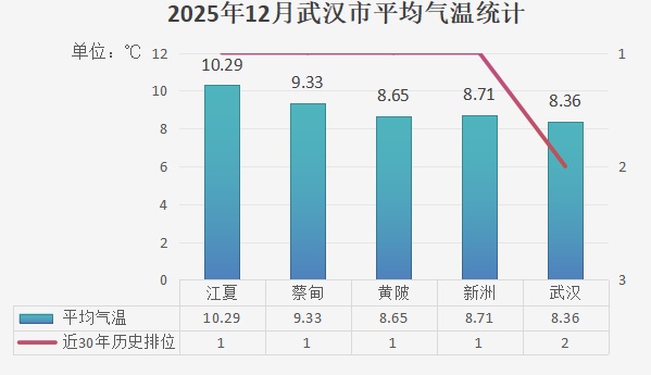 值得注意的是,今年12月以来武汉市气温有点特别,4个国家站平均气温达到近30年同期最高,1个国家站平均气温居近30年同期第2位。