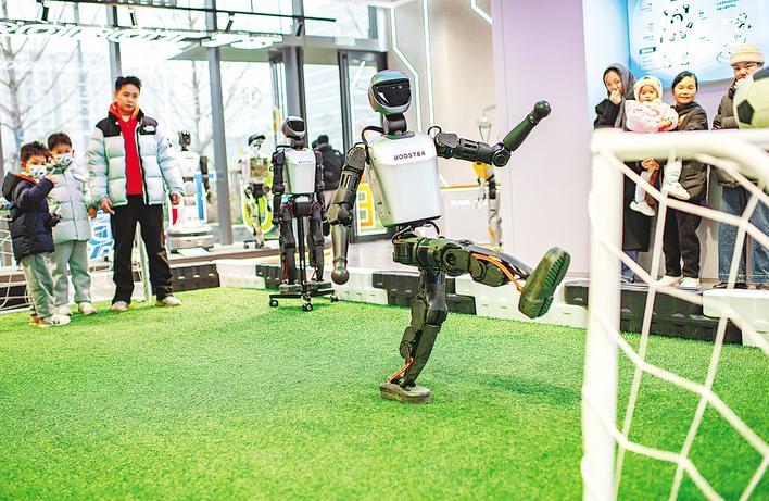 12月20日,在光谷人形机器人7S店内,一名小男孩在训练师的指导下,操控人形机器人踢足球。
