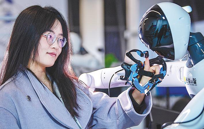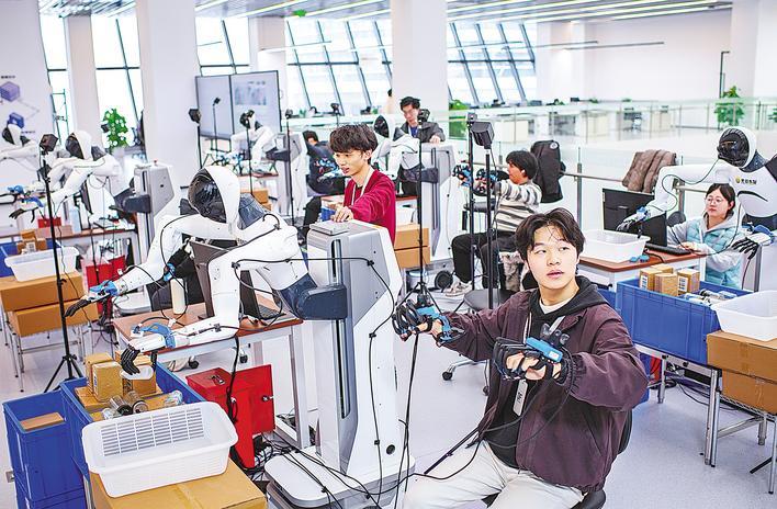 12月24日,湖北人形机器人创新中心,机器人训练师戴着外骨骼手套在工作。