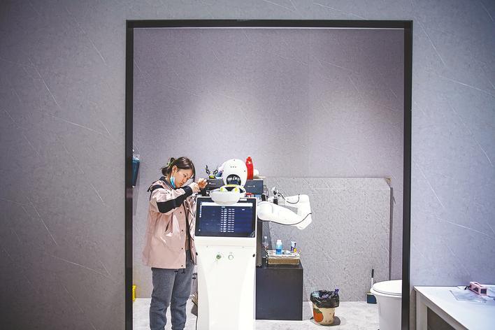 在奶茶场景区,训练师赵智龙操控机器人把放着两杯饮料的托盘精准送到客人手中。