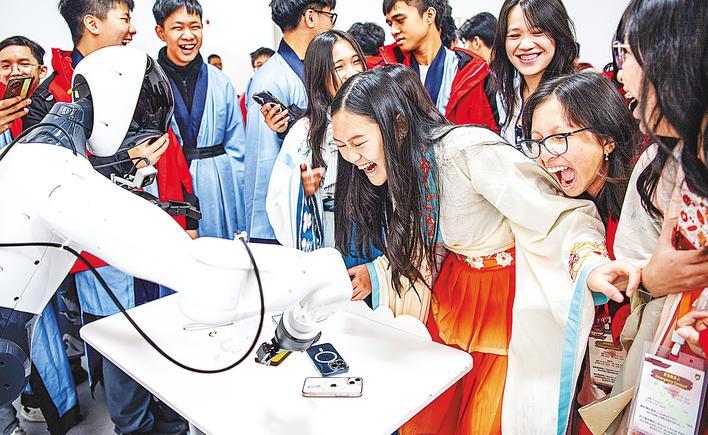 12月18日,来自印度尼西亚的学生在湖北人形机器人创新中心参观。这里正式投入运营后,每天来参观的游客接连不断。