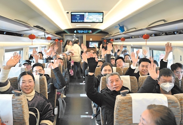 乘坐首发列车G6800次的旅客挥手致意 摄影:楚天都市报极目新闻记者李辉