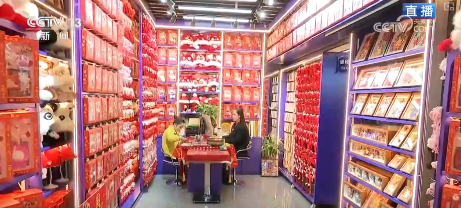 这里是商贸城的一区,这家店铺变化特别明显,半年前记者来的时候,这里还摆满了出口国外的节日用品。而现在,店里完全是另一番景象,放眼望去,满满的都是中国人自己过春节会用到的各种精美礼品和装饰。
