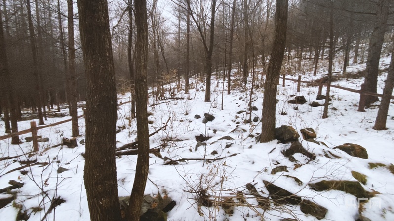 在山间的皑皑白雪中,一盘石碾默然矗立着
