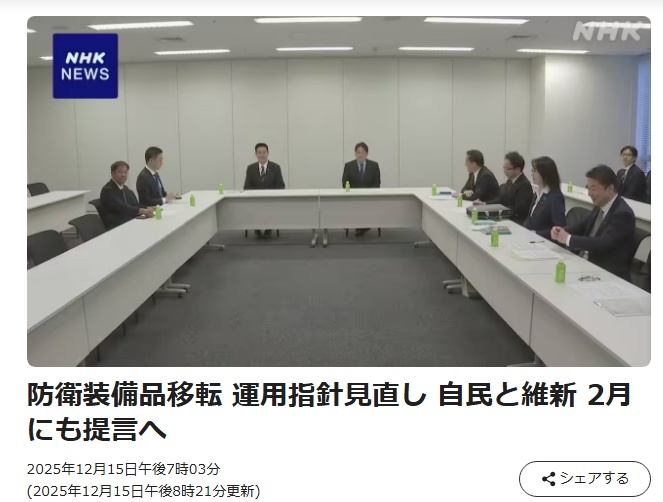 高市早苗政府上台以来,日本加速推进扩武强军,同时谋求进一步放宽武器出口限制。12月15日,日本执政联盟自民党与日本维新会就修改“防卫装备转移三原则”运用指南、取消对武器出口的5种类型限制达成一致,并确认将于明年2月向内阁提交相关动议。