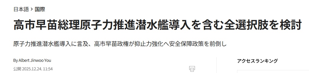 12月18日,有日本首相官邸官员公然宣称,鉴于面临所谓“严峻的安全保障环境”,日本应当拥有核武器。12月23日,高市早苗在接受采访时谈及所谓日本“是否应拥有核潜艇”问题时则宣称“不排除任何选项”。