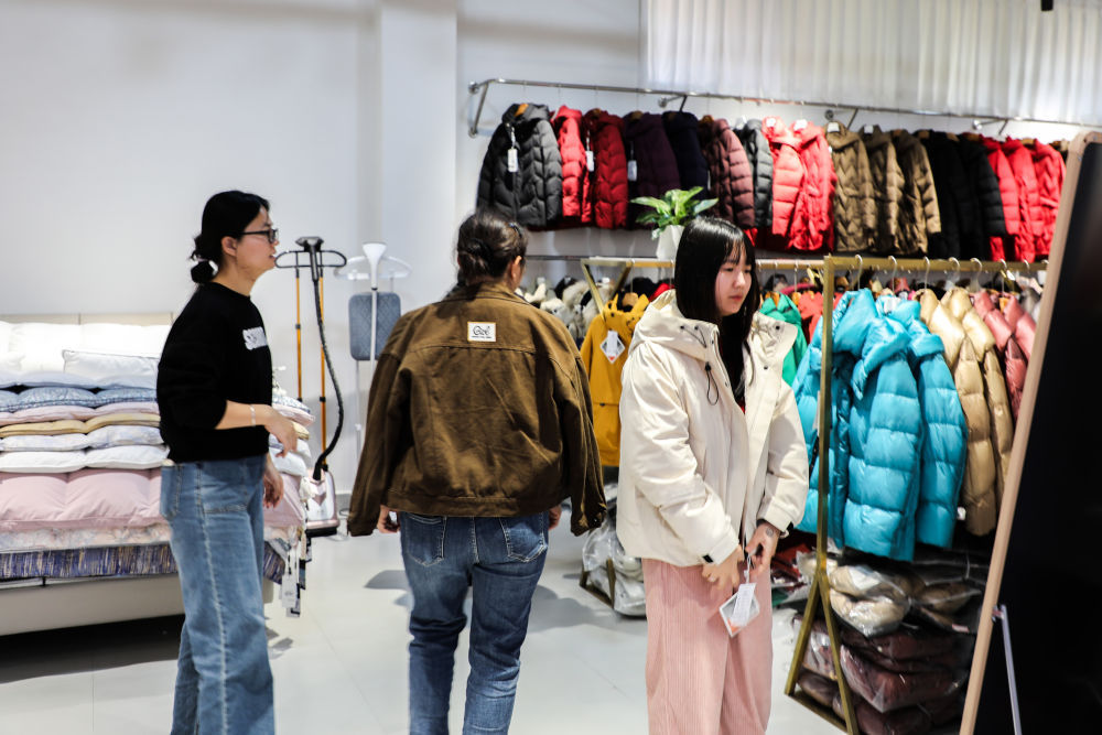 在广西贵港市港南区桥圩镇,消费者在选购羽绒服(12月18日摄)。