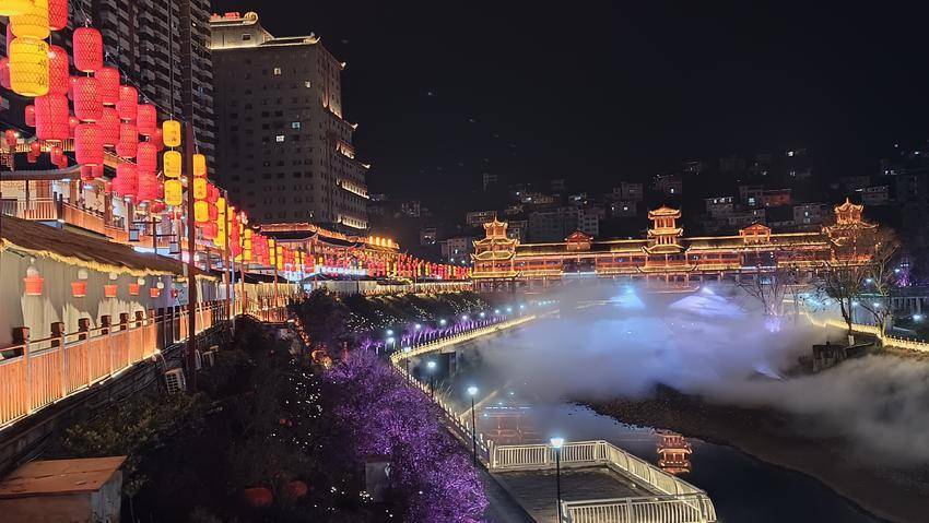 湖北日报客户端讯(通讯员 何启发 杜雪平)12月27日的鹤峰容美之夜,华龙半岛风情街被暖暖的烟火气所包裹。大红灯笼沿街高悬,映着游子归乡的匆匆步履,也照亮了一张张含笑的面庞。新年的脚步踏响街巷,他乡回归的游子与本地乡邻一同走进这团圆的驿站。