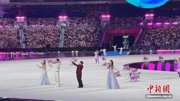 2025年11月,第十五届全国运动会开幕式暖场环节,容甄甄(右一)与广东、香港歌手同唱歌曲《紫荆花盛开》。 (受访者 供图)