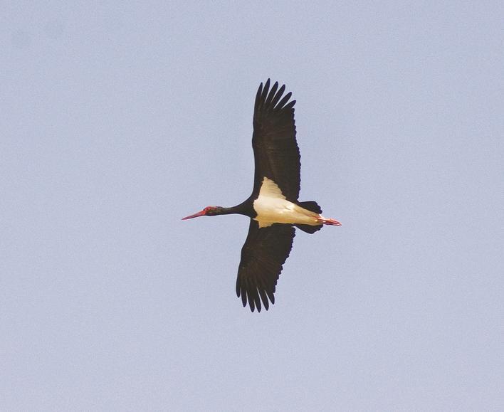 国家一级保护动物黑鹳在汉口江滩上空翱翔。