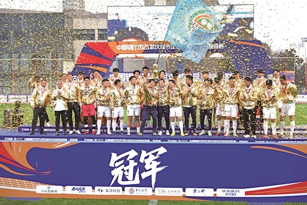 12月28日,2025武汉城市足球超级联赛收官之战,在塔子湖足球训练基地1号球场上演,城区组冠军东湖高新区队和高校组冠军武汉体育学院队争夺首届汉超超级杯冠军。在90分钟常规比赛时间里,双方战成0比0平。点球大战中,东湖高新区队以4比2获胜。图为颁奖仪式。