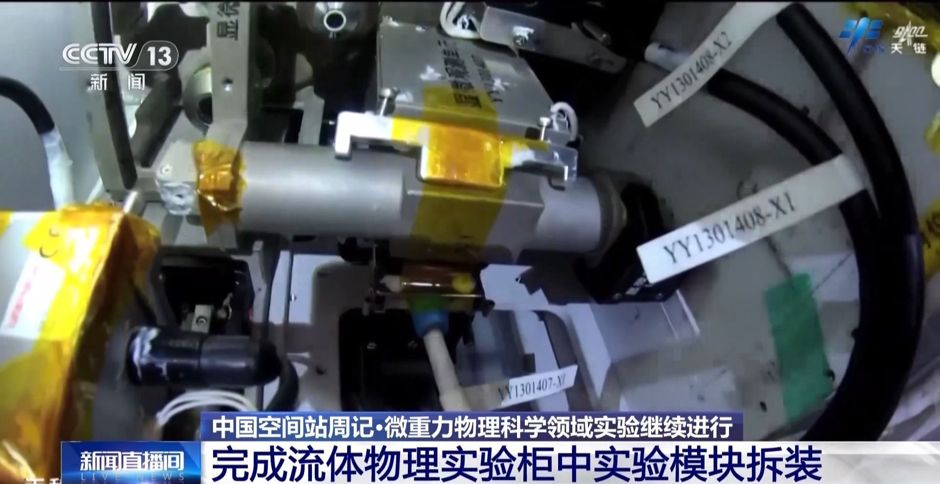 在微重力物理科学领域,乘组根据实验安排,完成了流体物理实验柜中复杂流体实验模块拆装,并更换了实验样品;乘组更换了燃烧科学实验柜内气体实验插件采样盖;乘组还进行了无容器柜实验腔体样品清理与更换、轴心机构电极维护等工作。