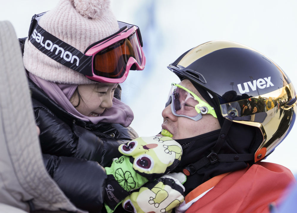 ↑12月20日,中国自由式滑雪运动员齐广璞(右)的女儿在赛后为他摘下护脸。齐广璞在河北省张家口市崇礼区云顶滑雪场进行的国际雪联自由式滑雪空中技巧世界杯(云顶站)中获得银牌。新华社记者 卢星吉 摄
