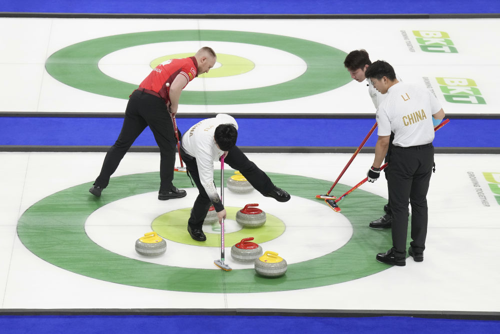 ↑4月6日,中国队选手徐晓明(左二)在加拿大穆斯乔举行的2025年世界男子冰壶锦标赛铜牌争夺战中。