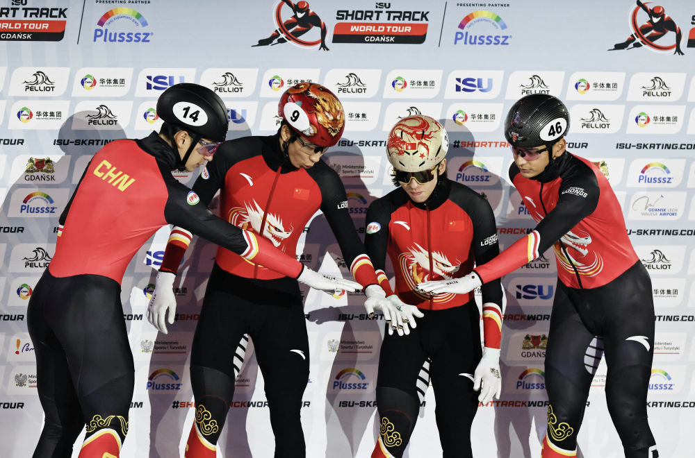 ↑11月23日,中国队选手刘少昂、孙龙、林孝埈、刘少林(从左到右)在在波兰格但斯克举行的2025-2026赛季国际滑联短道速滑世界巡回赛暨米兰冬奥会资格赛第三站男子5000米A组决赛前互相鼓励。最终,中国队获得亚军。新华社记者 高静 摄