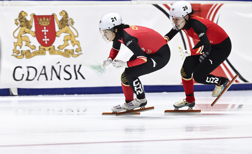 ↑11月22日,中国队选手臧一泽(右)和张楚桐在波兰格但斯克举行的2025-2026赛季国际滑联短道速滑世界巡回赛暨米兰冬奥会资格赛第三站女子3000米接力B组决赛中。最终,中国队获得第一名。新华社记者 高静 摄